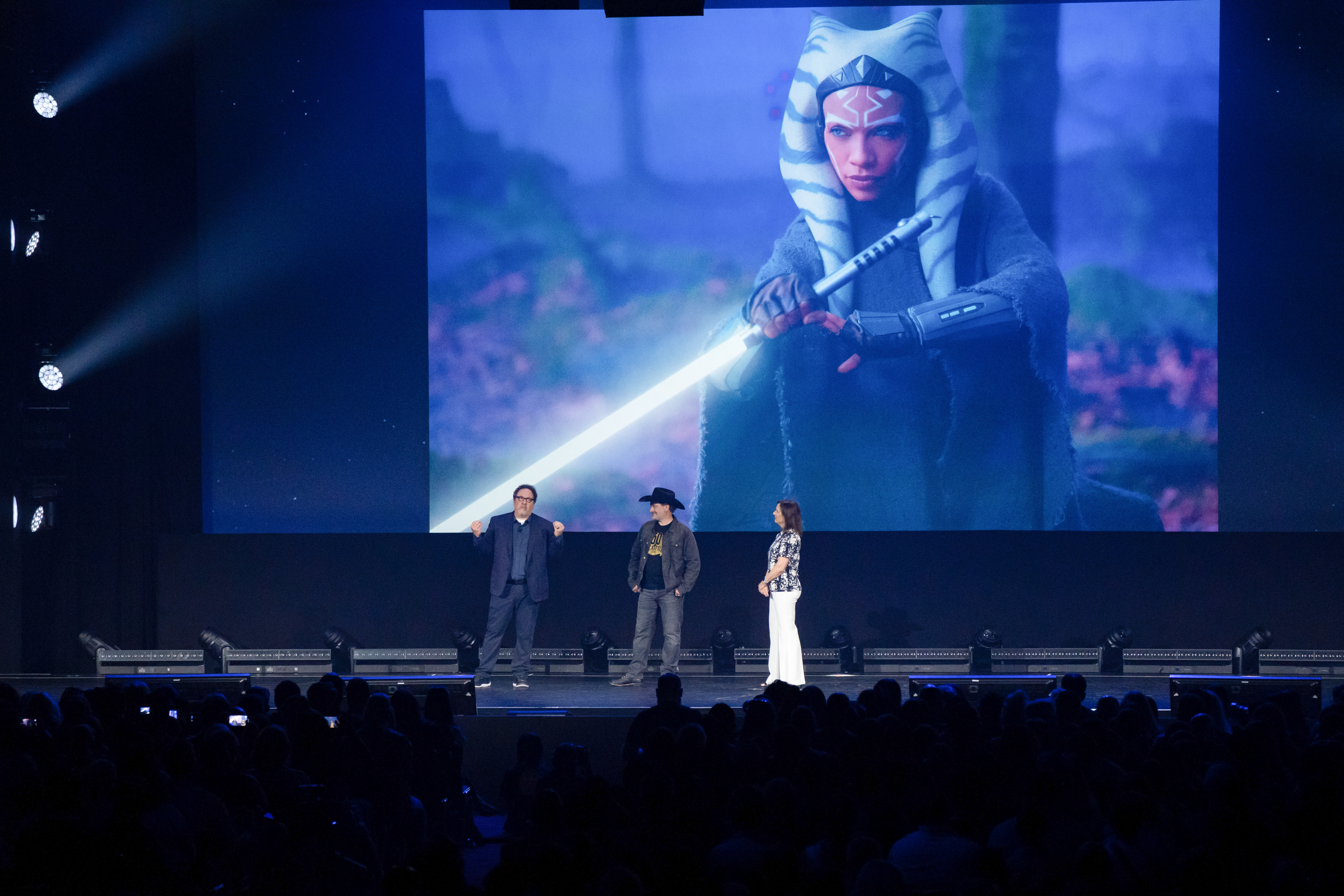 Jon Favreau, Dave Filoni, and Kathleen Kennedy presenting a production still from Ahsoka at D23 Expo 2022