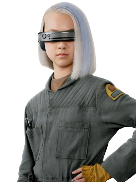 KB was intelligent and at times quiet and thoughtful.[10] Having spent her early childhood with "zero friends" she was afraid of speaking out about her needs so as to not antagonize her best friend Fern even when her own fragile health was at risk. KB had a grey cybernetic implant at the back and right side of her head. It was connected to another, visor-like implant which she could manually raise and lower, and which she kept in front of her eyes most of the time. She usually wore yellow fingerless gloves on her hands.[1]