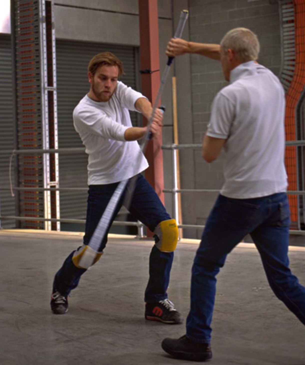 Ewan McGregor practices lightsaber combat with Nick Gillard.
