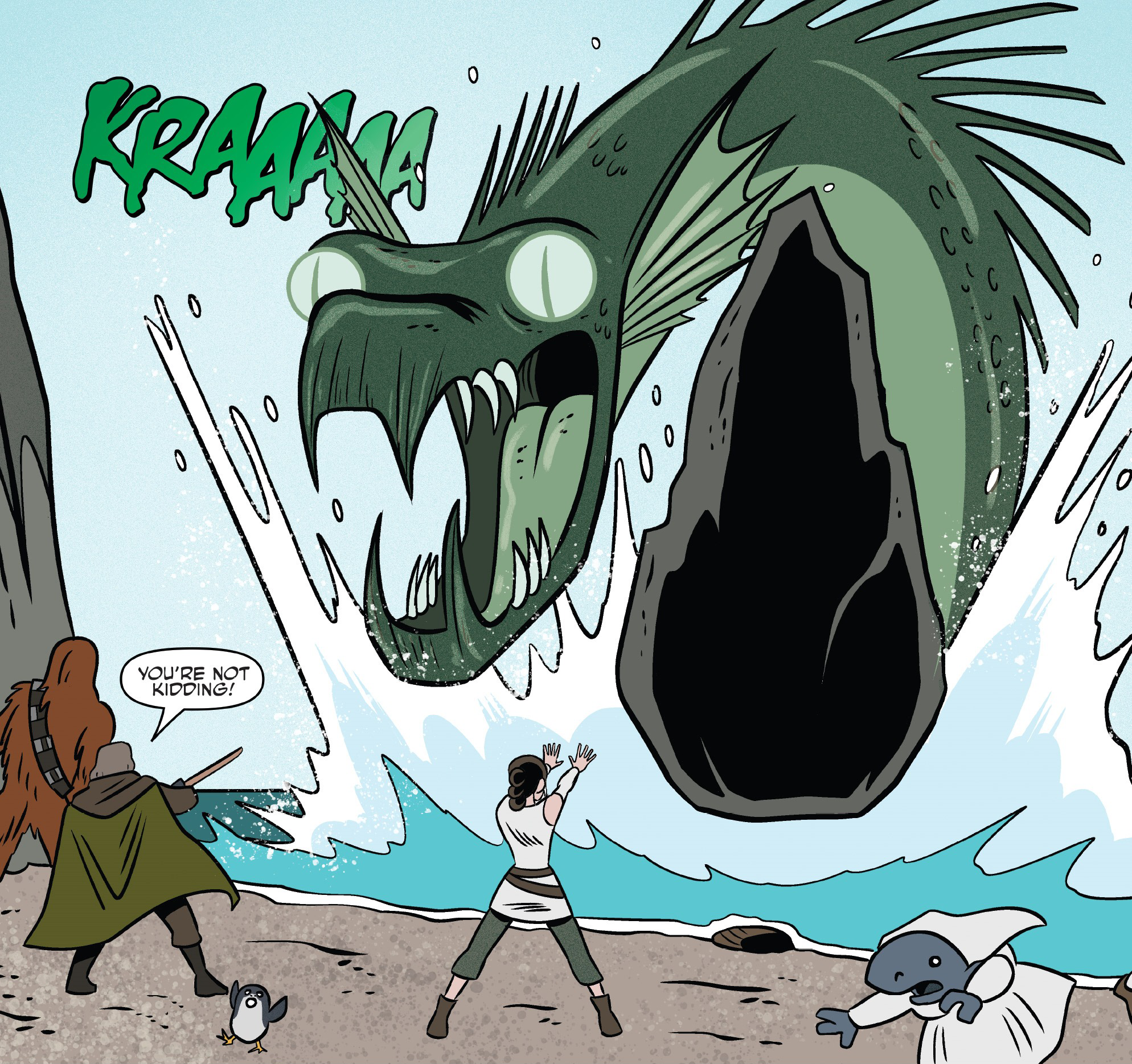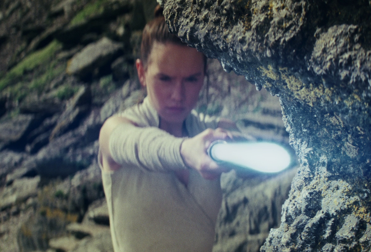 As Finn departed, Rey felt something drawing her towards the lower levels of the castle. She made her way down the steps with BB-8 and found a collection of ancient artifacts. One box in particular called to her, and she opened it to find a lightsaber. Upon touching it, she was immediately confronted with a vision of events both past and present she did not understand. Rey first found herself in the halls of Cloud City, where Skywalker had once fought Darth Vader before learning Vader was his father. She heard Skywalker screaming in disbelief at the revelation, as well as the words of the late Jedi Master Yoda speaking about the energies of the Force. Rey then saw Skywalker himself kneeling before a burning temple alongside his astromech droid, R2-D2, before the vision shifted to one of death: Kylo Ren and the Knights of Ren killing many people. The vision then transported her to Jakku, where Rey saw herself as a young girl screaming for her family to return as they departed in a starship. Finally, she found herself in the middle of a snowy forest, where Ren ignite his lightsaber and stalked towards her. The vision came to an end, she fell to the floor, and she heard the voice of the long-deceased Jedi Master Obi-Wan Kenobi telling her that these were her first steps.[6]
