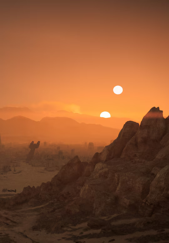 Tatooine was a sparsely inhabited circumbinary desert planet located in the galaxy's Outer Rim Territories. Part of a binary star system, the planet orbited two scorching suns, resulting in the world lacking the necessary surface water to sustain large populations. As a result, many residents of the planet instead drew water from the atmosphere via moisture farms. The planet also had little surface vegetation. It was the homeworld to the native Jawa and Tusken Raider species and of Anakin and Luke Skywalker, who would go on to shape galactic history.